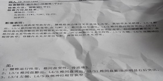 我叫王城光,今年48岁了,是一名人民教师,我先是感觉腰椎总是酸胀疼痛,逐步延续到屁股胯部的位置疼痛,再后来大腿和小腿开始麻木,不听使唤,我还以为我得了中风了,后来去医院拍了片子显示我L3/4椎间盘膨出,L4/5椎间盘突出,L5/S1突出并膨出,L3/4左侧,L4/5双侧,神经根管狭窄。 在医生的建议下做了微创手术,然后就在家休息待业,专家让休息了半年养病,本以为会越来越好呢,谁知道才回家半个月,就不行了,整个腰椎像断了一样,黑天白夜疼,经常夜里会疼醒,不吃止疼药根本不行,整条腿也使不上劲,弯不下腰,这怎么办?我就又去了医院,拍片子复查,专家依然坚定说手术很成功,不是手术的问题,可为什么我才做完微创半月,就比以前更厉害呢,他们建议我,不行就做个开放性手术,里边打几颗钉子,我这个时候,心里已经犯嘀咕了,都做过一次手术,害的我更厉害了,我怎么能相信让你们再给我做个大手术,我坚定的拒绝了,特别是当我知道很多西医自己得了这个病也没做手术!他们跟司机相反,是因为久站致病,属于手术医生高发的职业病!我推断手术必然存在相当的风险和隐患!最后在我的坚持下,我回了家,也不能去教课了,这段时间一直在寻求治疗我腰椎病的好办法。