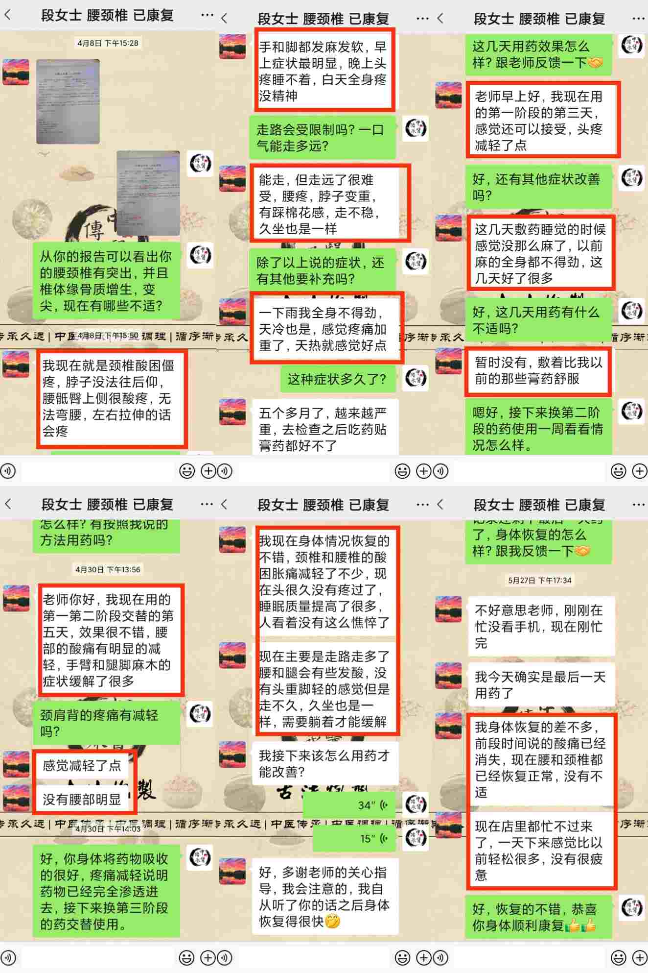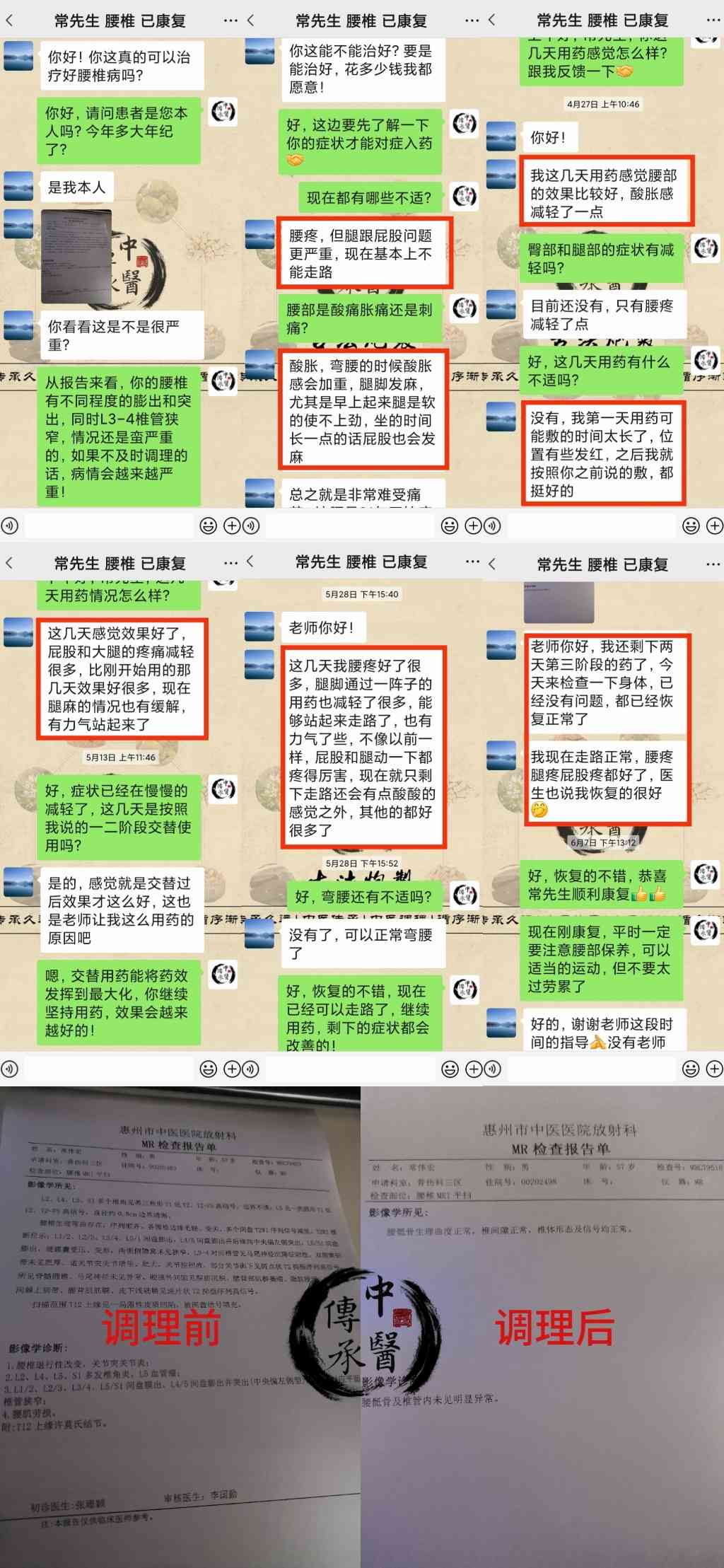 57 - 我今年42岁,腰椎病已经有5-6年了,去年检查说是腰椎间盘突出,腰椎酸痛,犯病时不敢直腰,双腿发麻,最后在病友群里看到了中医传承世家的可以治疗腰椎间盘突出,我就买了2个月的,用了感觉还不错,两只腿也不麻了,能干一些轻松的工作,现在我已经基本没有什么问题了,按照李老师的指导,再巩固一段时间就可以了。